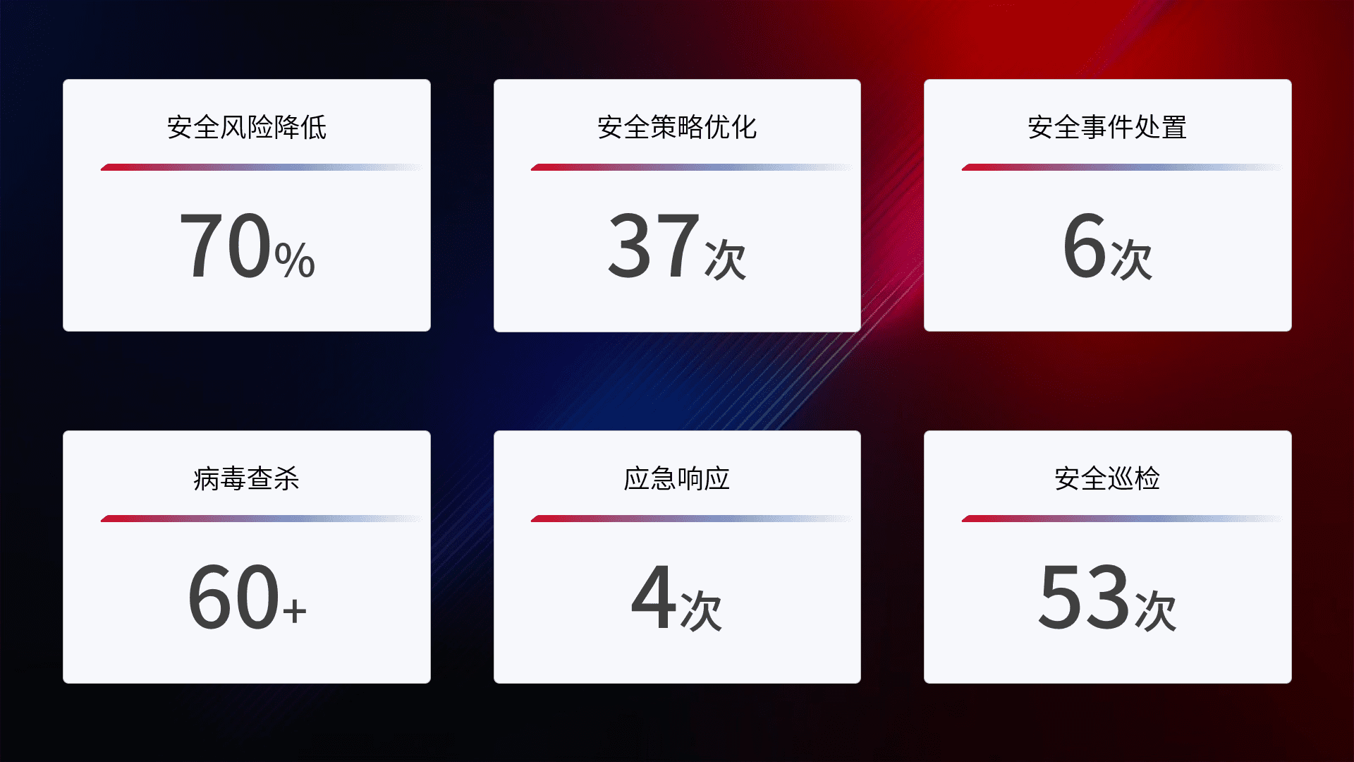 提供全面的安全事件报告体系,,,,包括处置报告、、、、周报、、、季度和年度总结,,结合持续监控,,帮助客户深入了解网络安全状况。。。。