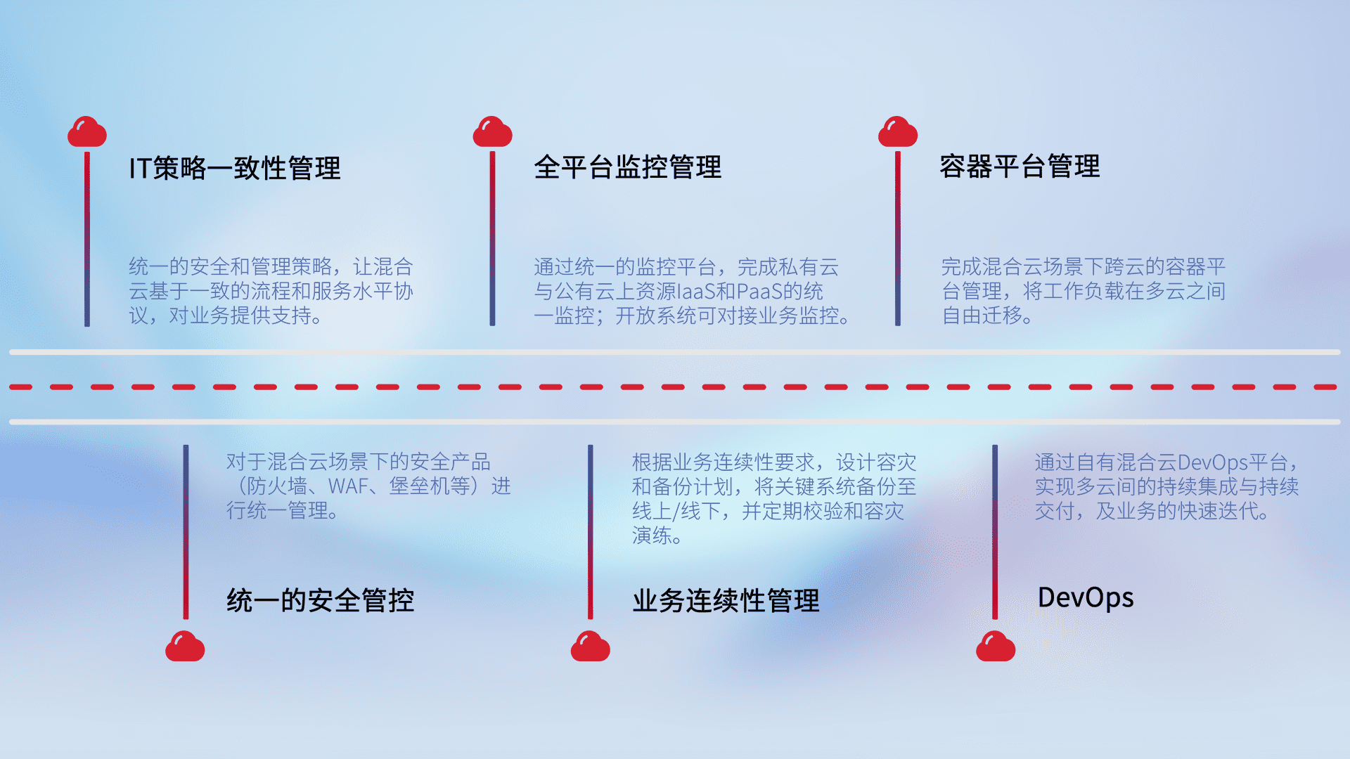 通过多云纳管,,,,以统一的资源数据模型把客户的云资源进行抽象和封装,,进而实现对多云资源的统一操作,,,保障云资源管理的可靠性、、、、稳定性与可用性。。。。量身定制化运维内容,,,,配置、、、开发运维、、补丁管理、、备份、、监控、、认证和访问管理、、审计和日常巡检等,,保障在用云过程中的可靠度,,稳定度以及高可用率。。