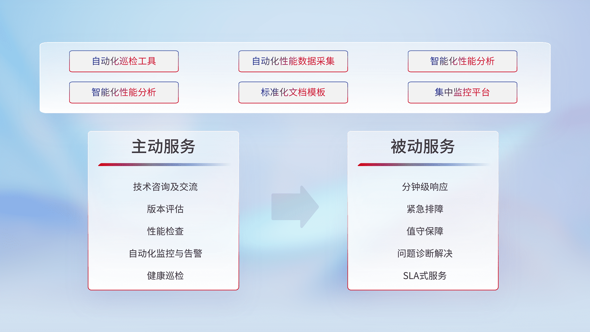 智能化工具和标准化文档,,,保障服务质量,,提供主动服务(包含技术咨询、、版本评估、、、、性能检查、、自动化监控与告警、、、健康巡检)和被动服务包含(分钟级响应、、紧急排障、、、、值守保障、、、、问题诊断解决、、、、SLA服务)。。。
