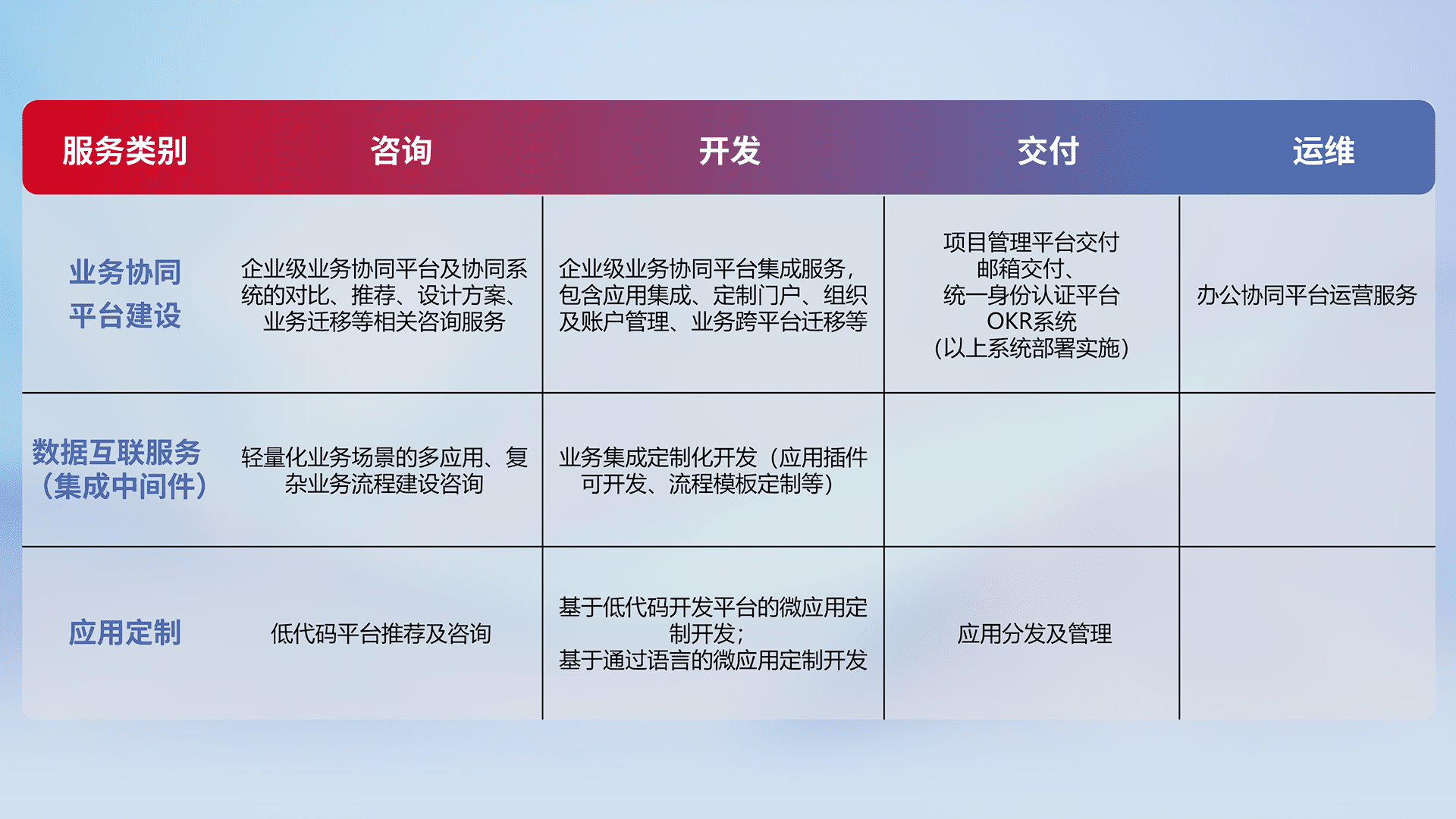 针对钉钉、、、企微、、、、IDaas等平台级产品提供产品的规划、、、、方案、、交付、、定制化开发等服务,,实现如统一协同办公、、智能客户服务、、、、混合会议管理、、、、智能数据查询、、等业务场景,,,实现数字化转型。。。